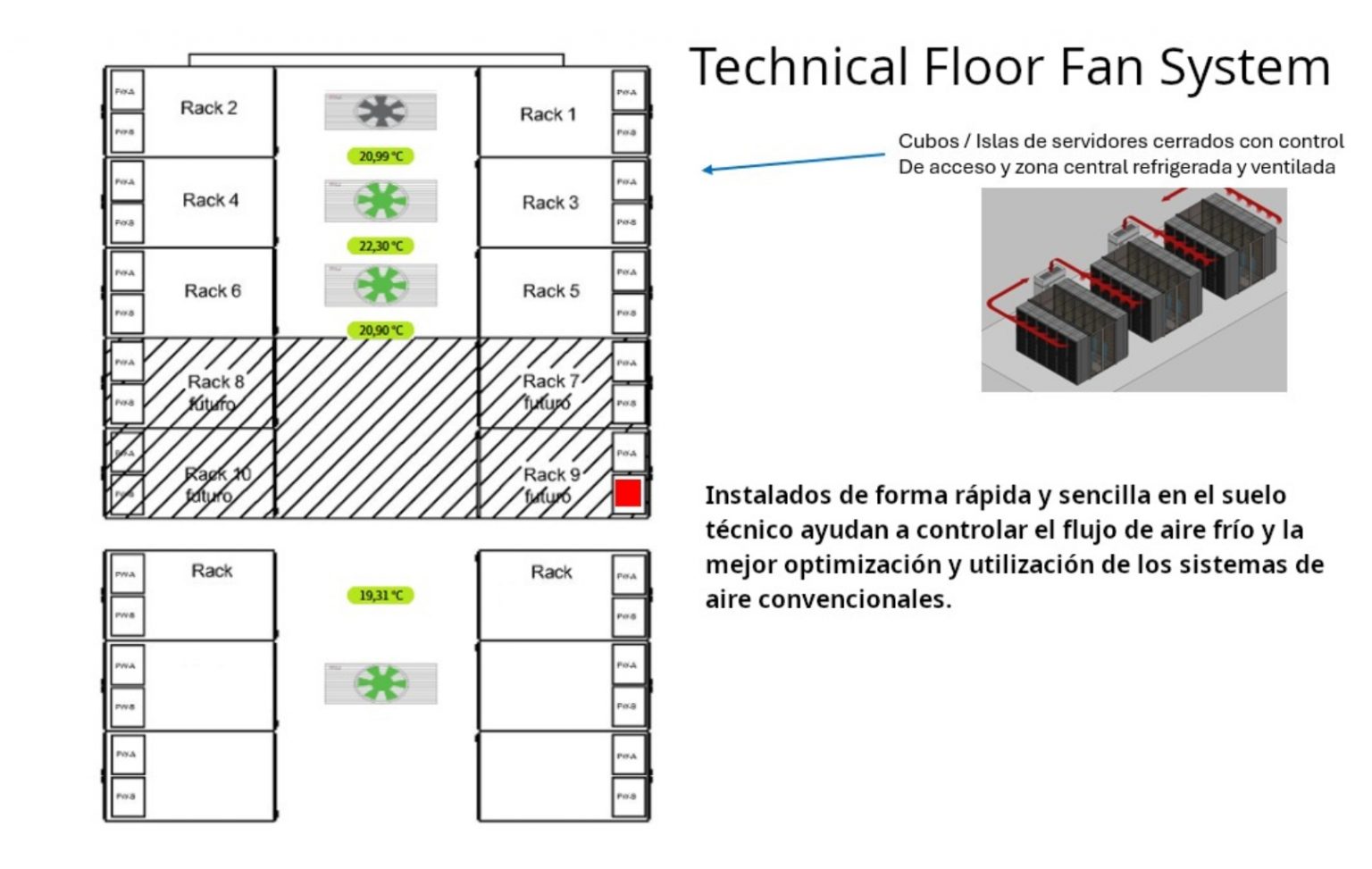 El Technical Floor Fan es un dispositivo diseñado para instalarse en el suelo técnico de los Centros de Proceso de Datos (CPD). Su función es optimizar la distribución del aire frío suministrado por los sistemas de climatización. Al integrarse directamente en las placas del suelo, permite canalizar de manera dirigida el flujo de aire hacia los racks o las zonas de mayor carga térmica, regulando así la cantidad de refrigeración que recibe cada área según su necesidad.